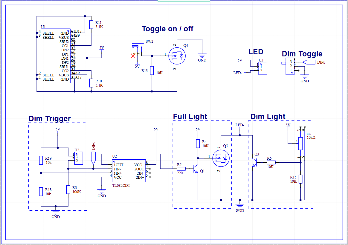 Figure 1 represents the first iteration of the driver. USB-C for power delivery, 5V input and a max current delivery of 3A allowed for 15W of total power. With the toggle switched rated for 100mA, running the current through a NFET who's Vgs was controlled by the toggle switch as the best choice.